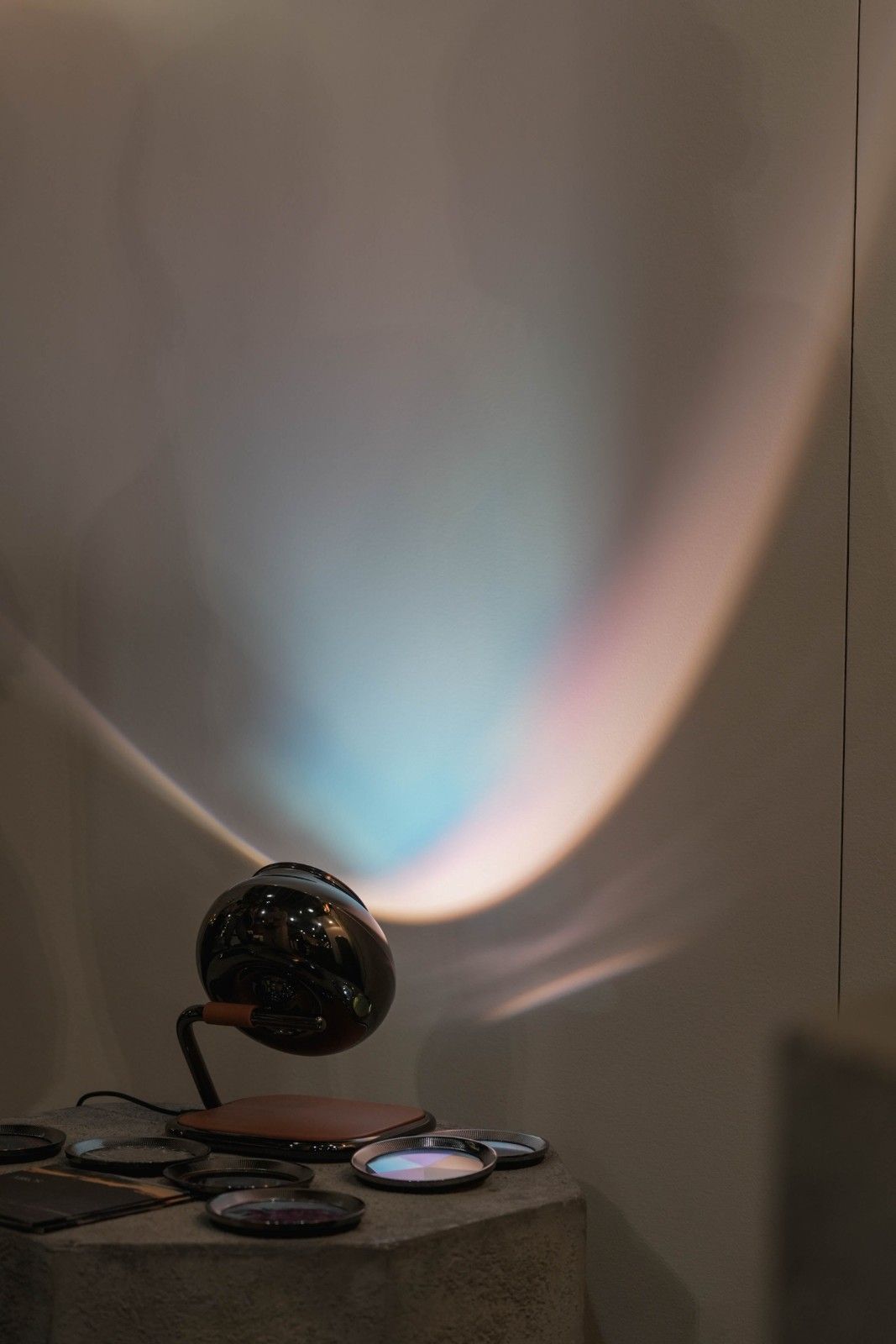 Material filter yang digunakan dalam lampu ini menggunakan lensa kaca magnetik yang bergerak sederhana. Permainan cahaya dalam siklus yang terbatas menciptakan efek yang menarik. Lampu ini mampu mencerminkan keteraturan alam semesta dalam sebuah ruang yang memadukan waktu dan cahaya.